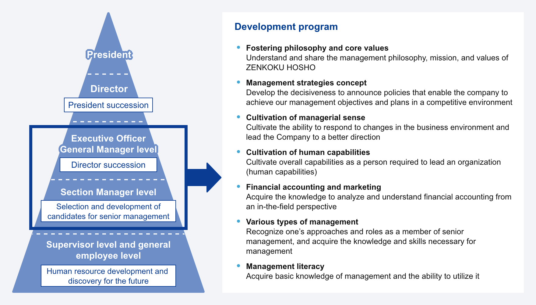 In relation to the types of persons required for the management of ZENKOKU HOSHO, we have determined that they must understand and practice the management philosophy of ZENKOKU HOSHO, possess the corporate culture (core values) of ZENKOKU HOSHO, and have a vision for the future (management strategy) of the ZENKOKU HOSHO Group. As part of the candidate selection process, we will focus on the development of candidates at the section manager level and above through a combination of "strategic placement and task execution (OJT)," "training (Off-JT)," and "assessments," thus narrowing down the final range of successor candidates. In order to ensure objectivity and transparency and prevent arbitrary decisions playing a role in the final selection process, we conduct the selection through meetings of the Evaluation and Development Meeting, and then verify the appropriateness of the decision at the management level at a meeting of the Nomination and Compensation Committee.