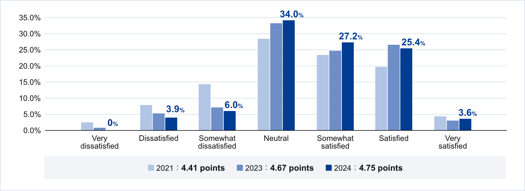 The average overall satisfaction score* in the employee awareness survey conducted in FY2025/3 was 4.75 points, producing favorable results and exceeding the previous results (4.67 points in the 2023 survey) and median of 4 points.